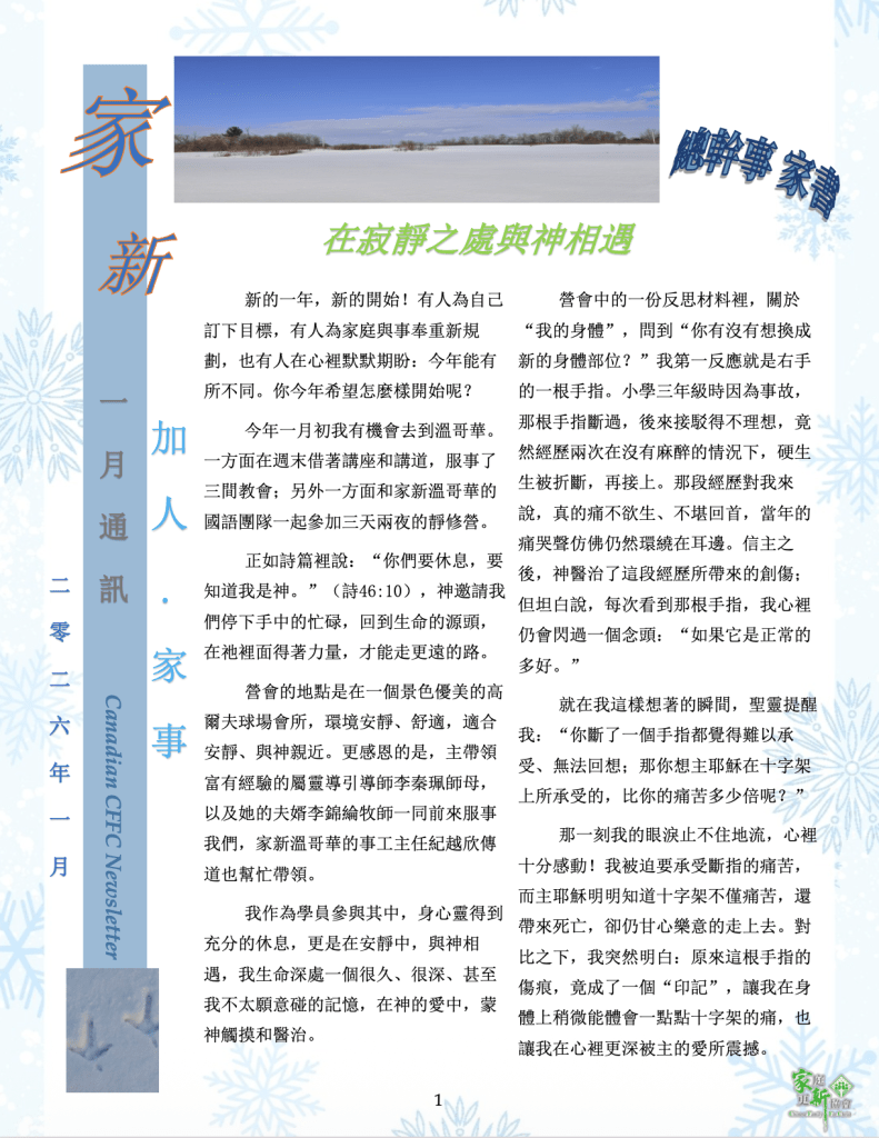 主頁 公告欄 最新一季 「家新通訊」已出刊 202601 MER1報名 多倫多/巴拿马 渥太華/滿地可 草原三省 溫哥華/西雅圖 MER2報名 全 加 拿 大 最新一季 「家新通訊」 202601 家新見證系列 家新見證系列一: 傳揚福音 家新見證系列二 夫婦門訓 家新見證系列三 – 普世宣教 家新見證系列四 – 教牧夫婦營