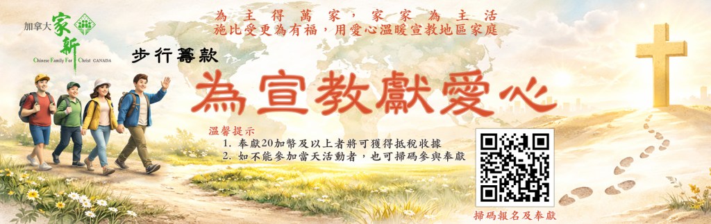 主頁 公告欄 最新一季 「家新通訊」已出刊 202601 MER1(恩愛夫婦營)報名 多倫多/巴拿马 渥太華/滿地可 草原三省 溫哥華/西雅圖 MER2(夫婦進深營)報名 全 加 拿 大 最新一季 「家新通訊」 202601 家新見證系列 家新見證系列一: 傳揚福音 家新見證系列二 夫婦門訓 家新見證系列三 – 普世宣教 家新見證系列四 – 教牧夫婦營