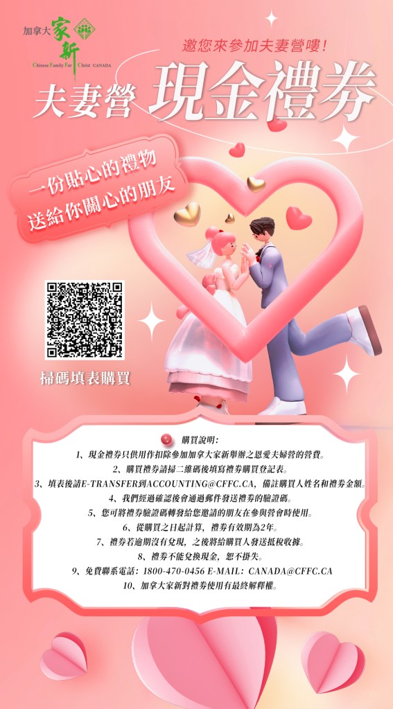 1、現金禮券只供用作扣除參加加拿大家新舉辦之恩愛夫婦營的營費。